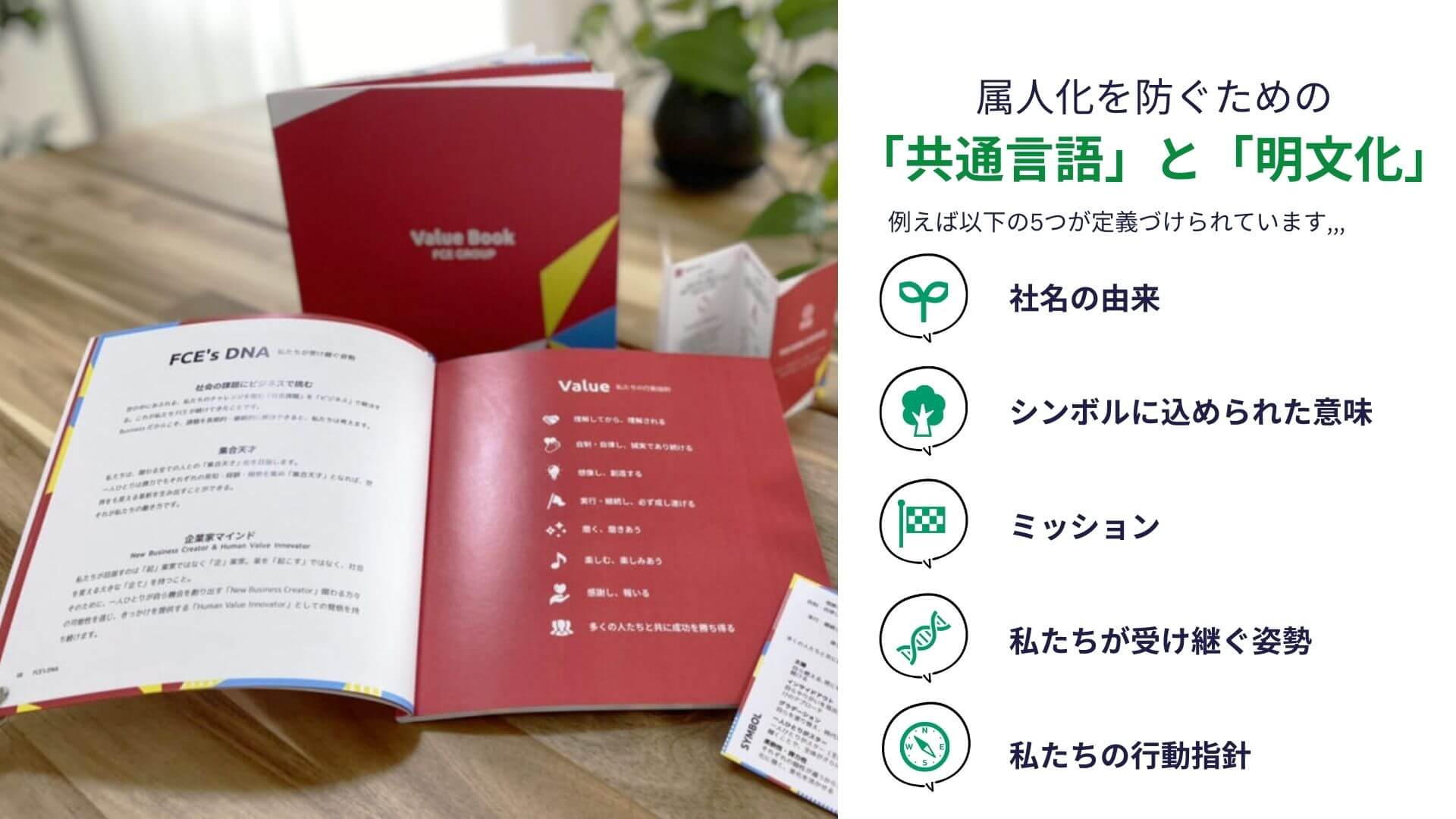 ValueBOOKには、FCEが大事にしている価値観や行動基準が整理されています。