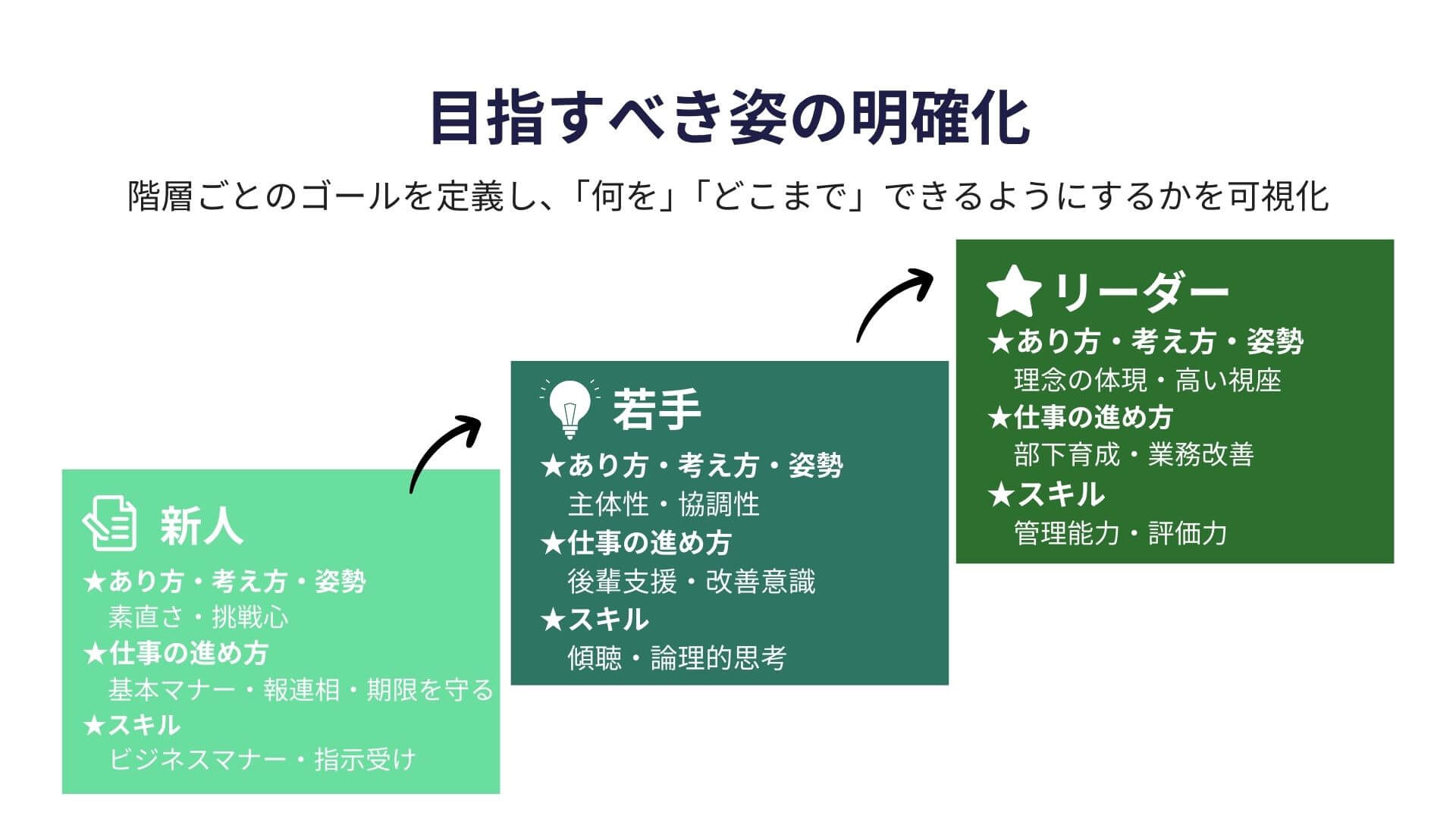 たとえ「活躍できる人材像」という会社の定義があっても、それが新人・若手・リーダーと階層別に具体化されていないと、育成方針がバラバラになります。