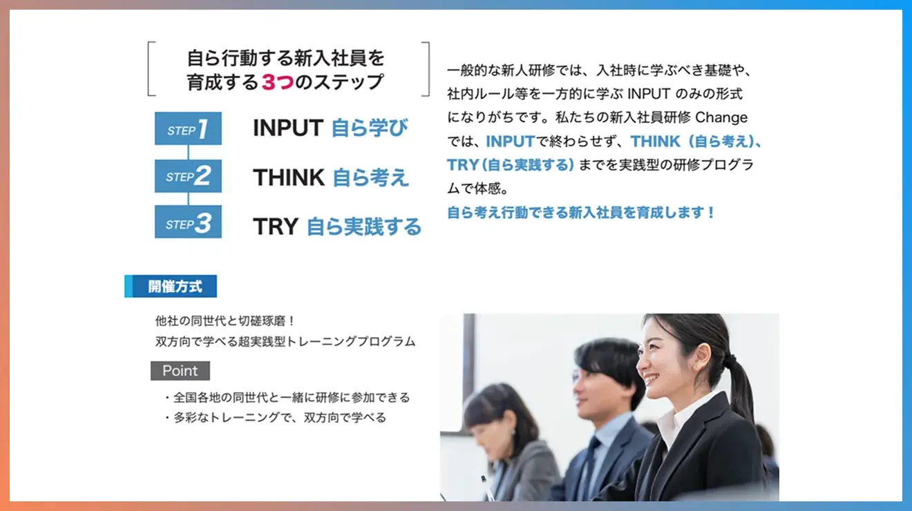 一般的な新人研修では、入社時に学ぶべき基礎や、社内ルール等を一方的に学ぶ INPUT のみの形式になりがちです。私たちの新入社員研修 Changeでは、INPUT で終わらせず、THINK(自ら考え)、TRY(自ら実践する)までを実践型の研修プログラムで体感。 自ら考え行動できる新入社員を育成します!