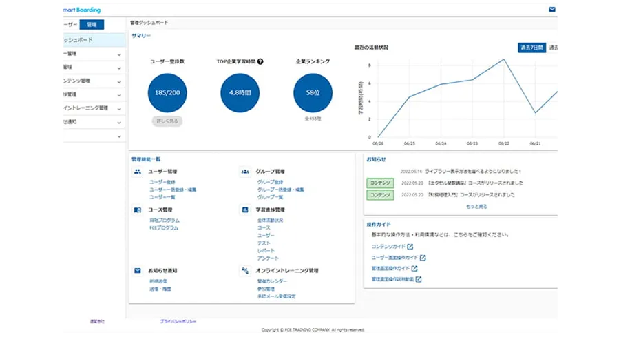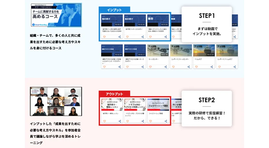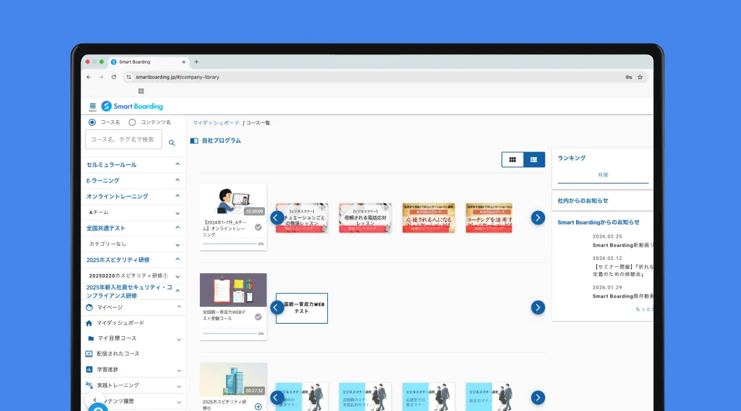 社内研修やOJTをSmart Boardingに集約し、プロトレーナーのコンテンツと組み合わせて、効果的な教育制度を構築・管理できます。