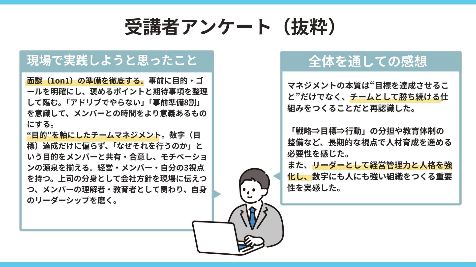 全国に拠点がある中で、評価の伝え方やマネジメントの質に差が生まれていたことが課題でした。オンラインの共通教材と講師派遣型の評価者研修(対面)を組み合わせることで、管理職層が同じ基準で部下と向き合えるようになり、共通言語づくりにもつながりました。