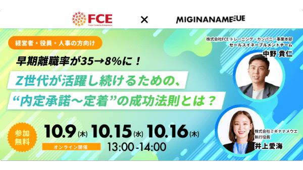 株式会社FCE(本社:東京都新宿区、代表取締役社長:石川淳悦、証券コード:9564)が提供する、社員教育プラットフォーム「Smart Boarding」(https://smartboarding.net/) は、株式会社ミギナナメウエと共催セミナーを開催いたします。