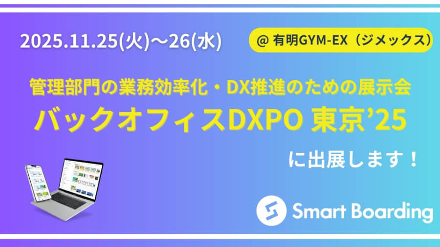 株式会社FCE(本社:東京都新宿区、代表取締役社長:石川淳悦、証券コード:9564)が提供する、社員教育プラットフォーム「Smart Boarding」(https://smartboarding.net/) は、2025年11月25日(火)、26日(水)の2日間、「バックオフィスDXPO 東京’25」に出展いたします。