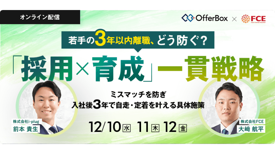 株式会社FCE(本社:東京都新宿区、代表取締役社長:石川淳悦、証券コード:9564)が提供する、社員教育プラットフォーム「Smart Boarding」(https://smartboarding.net/) は、株式会社i-plug と共催セミナー『若手の3年以内離職、どう防ぐ? 「採用×育成」一貫戦略 ミスマッチを防ぎ入社後3年で自走・定着を叶える具体施策』を開催いたします。