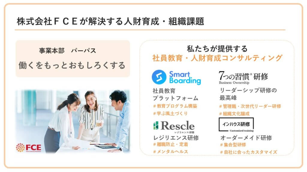 株式会社FCE トレーニング・カンパニー事業本部では、「働くを『もっと』おもしろくする」をテーマに、世界的ベストセラー『7つの習慣』の企業向け研修などをはじめとしたトレーニングやコンサルティング、またオンライン研修やeラーニングシステム「Smart Boarding」を提供しています。 中堅・中小・ベンチャー企業様から大手企業様まで4,500社を超える企業の成長サポートをしております。
