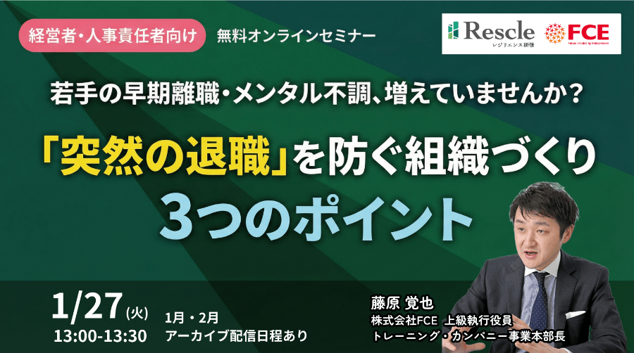 株式会社FCE(本社:東京都新宿区、代表取締役社長:石川淳悦、証券コード:9564)は、最新セミナー『若手の早期離職・メンタル不調、増えていませんか? 「突然の退職」を防ぐ組織づくり 3つのポイント』を開催いたします。