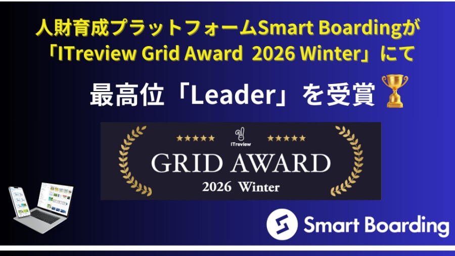 株式会社FCE(本社:東京都新宿区、代表取締役社長:石川淳悦、証券コード9564)が提供する「Smart Boarding 」は、アイティクラウド株式会社が主催するアワード「 ITreview Grid Award 2026 Winter」において、「LMS」「オンライン研修ツール」の2部門で、満足度・認知度ともに優れた製品と評価され、最高位である「Leader」を受賞いたしました。