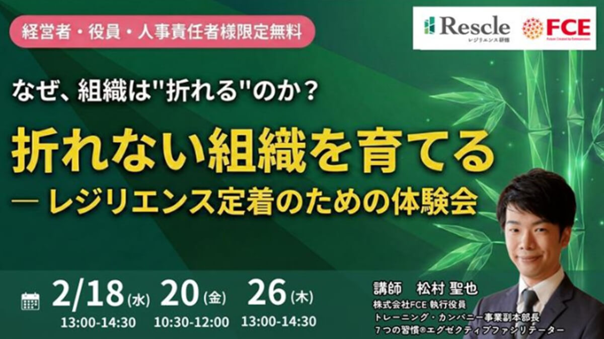 株式会社FCE(本社:東京都新宿区、代表取締役社長:石川淳悦、証券コード:9564)は、最新セミナー『折れない組織を育てる ーレジリエンス定着のための体験会』を開催いたします。